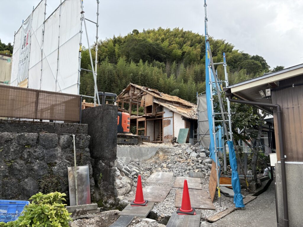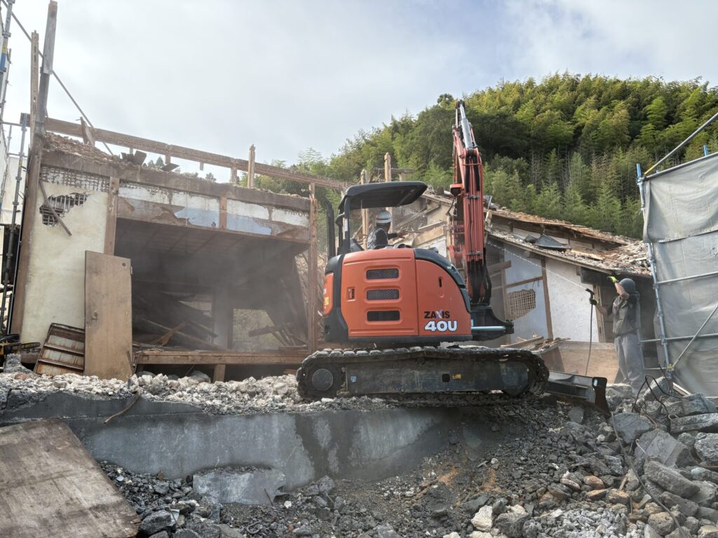 手前のRC造の建物を解体後重機を一段上げて木造の解体工事の様子です。