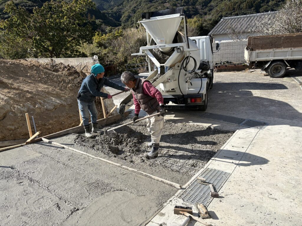 生コンクリート打設状況です、4t車が入ってこれず2t車をレンタルしました。